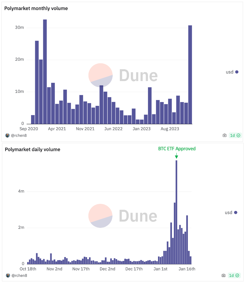 - Polymarket, a leading decentralized predictions market on Ethereum, is on pace to set a monthly record for betting volume on the platform. This was boosted on the back of the January 10th Bitcoin ETF approval that brought in daily volume records.