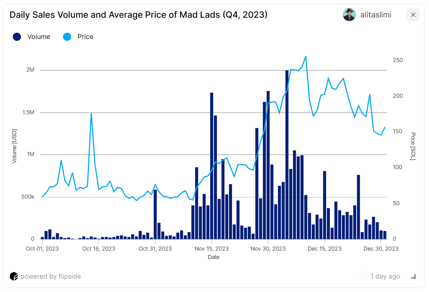 - The floor price of Mad Lads surged from 50 SOL to roughly 200 SOL in Q4. Initiatives by the collection's team such as the introduction of the Backpack exchange marked the initial catalyst. Like many prominent crypto collections, Mad Lads have also received major airdrops, which fueled demand.