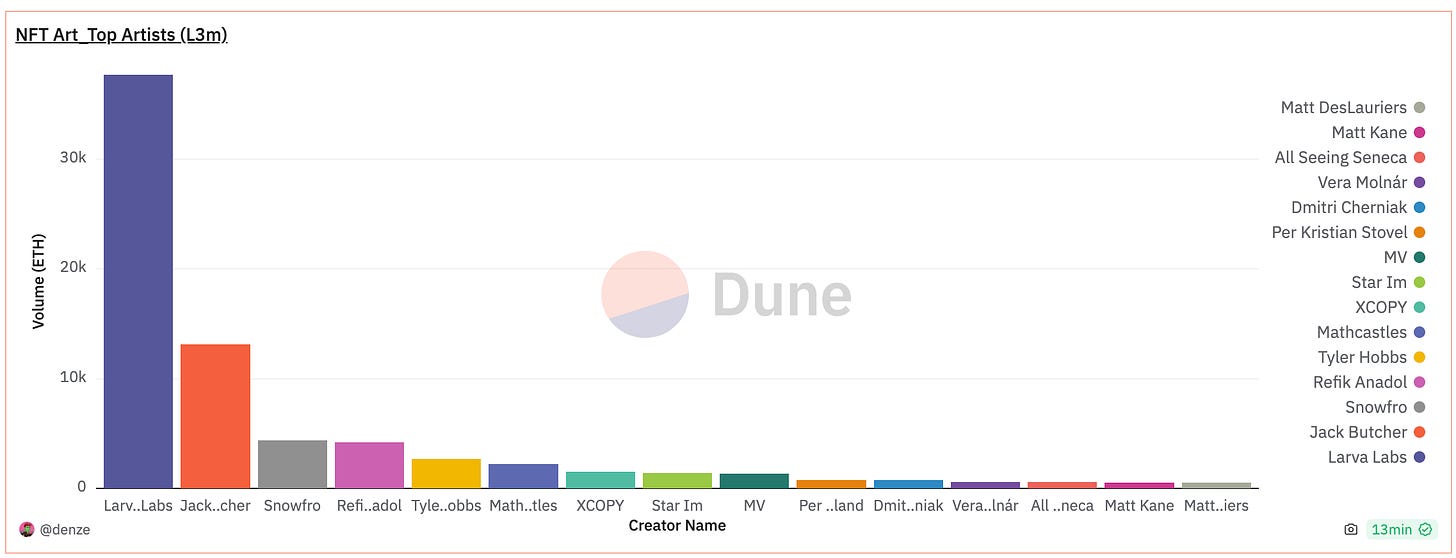 - While artists continue to grow their portfolios, demand is often concentrated in few collections. For example, 86% of Larva Labs volume was for CryptoPunks and 95% of Refik Anadol's volume was from Winds of Yawanawa. In contrast, volume for artists like Jack Butcher and Snowfro has been more evenly distributed.