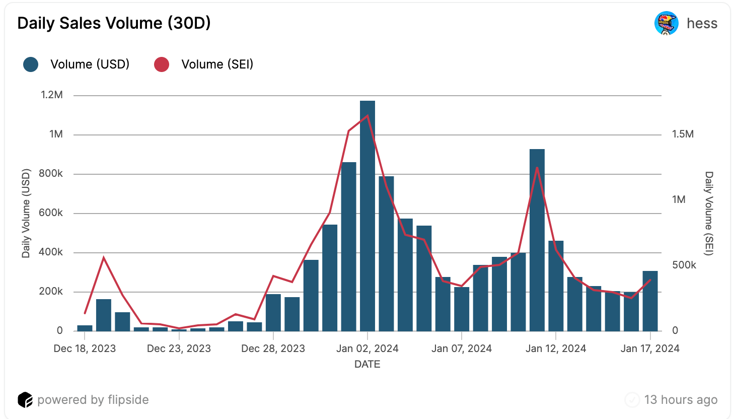 - It is not uncommon for alternative L1 chains (in this context, those other than Bitcoin or Ethereum) to boast robust NFT markets supported by active and loyal communities. Sei, which only launched its mainnet in August 2023, already shows NFT sales volume close to or exceeding $1M on some days.