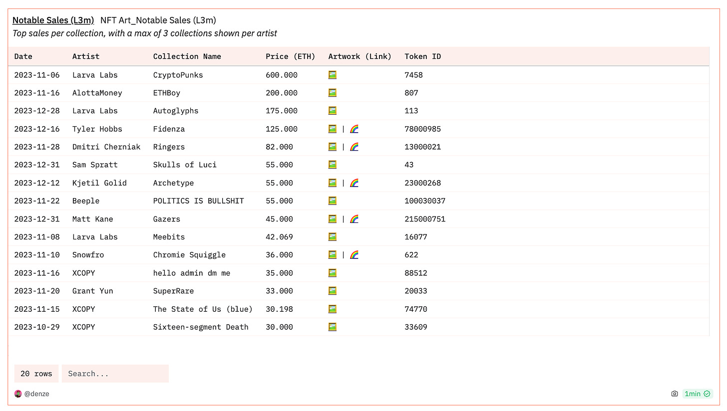 - Top sales are another key metric for NFT Art, especially since some artworks or collections are rarely sold. This is often the case for 1/1s, low supply editions or "grails" of collections. Recent top sales include ETHBoy, a 1/1 by Trevor Jones & Alotta Money (200Ξ) and Sam Spratt's Skulls of Luci (55Ξ).