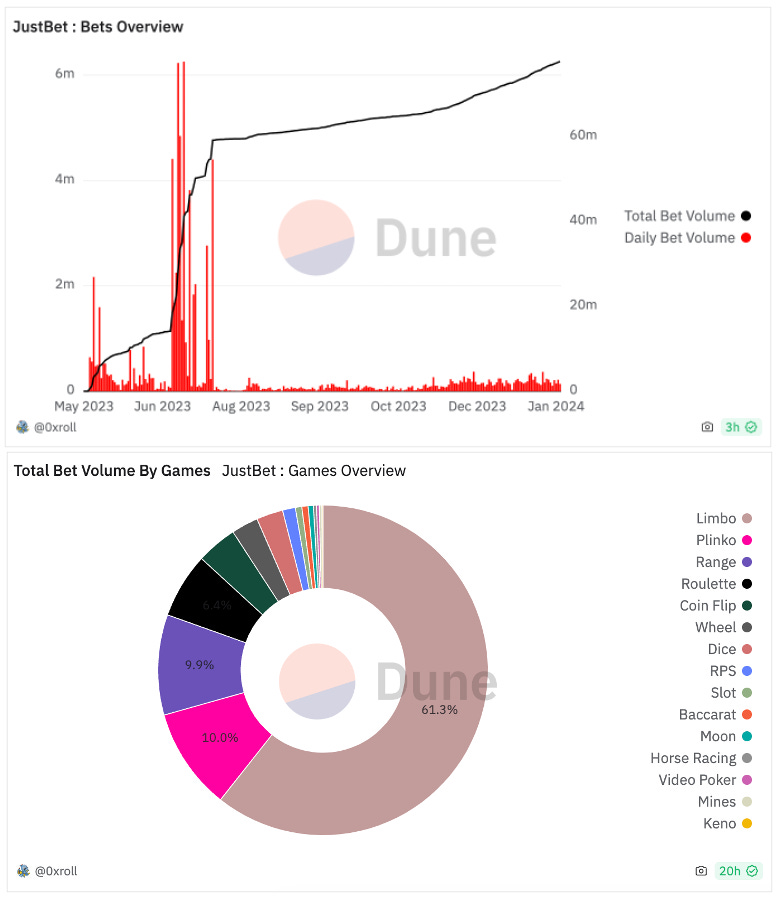 - JustBet – a decentralized casino developed by WINR Labs – has seen $77.6M of betting volume since its launch just 9 months ago, despite a regression from summer 2023 highs. The platform's breakout game, Limbo, has captured >60% of this betting volume to date, with Plinko taking 10% of betting share.