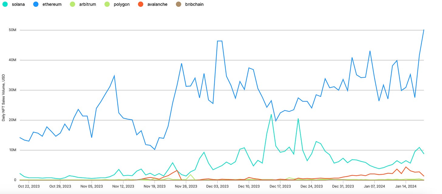 - Ethereum has retained its lead NFTs and achieved $10-50M daily sales volume in the past 3 months. But other Layer 1 blockchains are nipping at its heels, from Solana’s ecosystem-wide revival, to Bitcoin’s popular Ordinals, and NFT activity on other L1s such as Flow, Sei, and more. December 2023 was a particularly noteworthy month for Solana, when daily NFT sales on this chain surpassed $20-22M just on some of the most popular collections.
