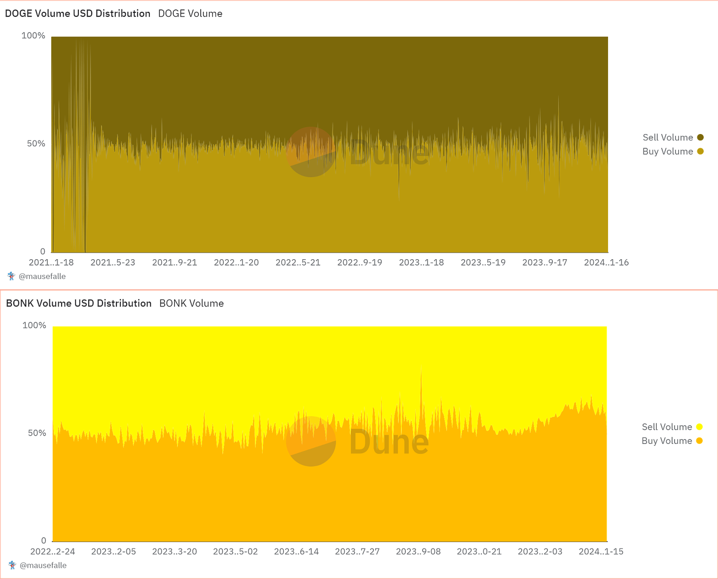 - Looking at the buy/sell ratio both are staying consistently within 10% points of parity. What is evident however is that BONK is able to maintain a —still running— buy ratio of +55 since the beginning of December. DOGE was not able to gain the same momentum in any period since mid 2021.
