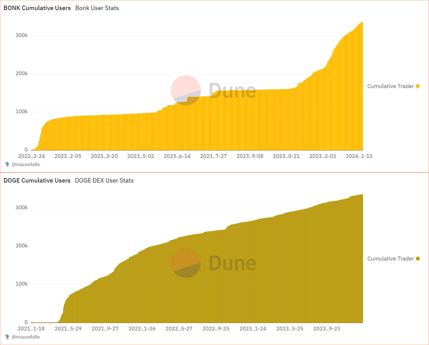 - BONK established its position as the premier memecoin on Solana after a 10x compared to its previous high in January 2023. It is currently the 3rd largest memecoin by marketcap and rivals Dogecoin. Cumulative DEX users for both are around 330k. BONK's users tended to onboard during its bull runs. Bonk generated 14.5M DEX Transactions since launch. DOGE generated 5.5M. The highest BONK DEX Volume was in mid December with $350M+ whereas DOGE topped out in May 2021 with $80M.