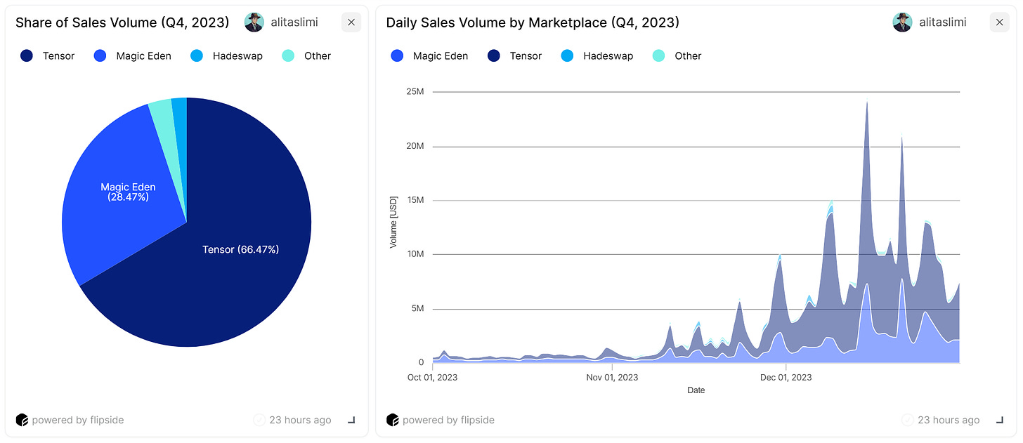 - Tensor has emerged as the go-to marketplace for Solana's users. The project incorporated features such as cNFTs, a collection called Tensorians, and implemented a point system. Magic Eden, Tensor's competitor, has shifted its focus towards opportunities on other blockchains, like Bitcoin Ordinals.
