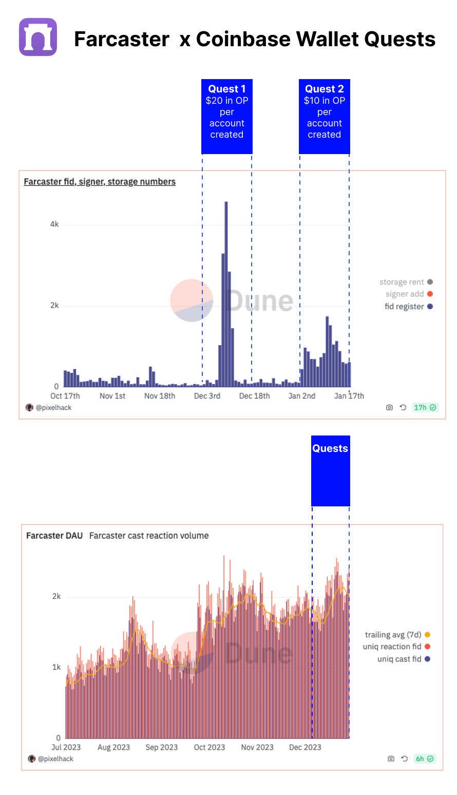 - 💦🔬 Tx-Level Alpha: More than 25k accounts were created on Farcaster during the Coinbase Wallet quests period. While not necessarily all accounts created are directly attributable to the quest, this represents more than 60% of accounts created in the last 3 months.