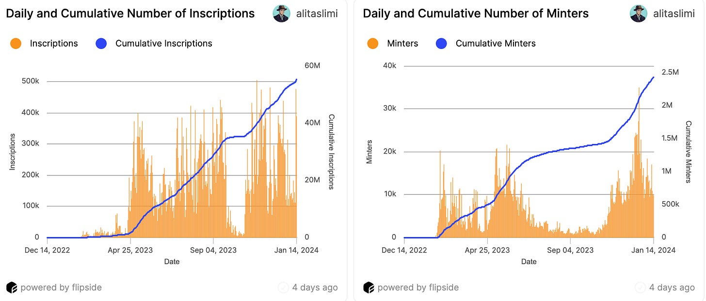 - 💦🔬 Tx-Level Alpha: Ordinals inscriptions are becoming an increasingly popular NFT-esque format. Amid a wave of protocols following in Bitcoin’s example, Flowverse marketplace released their own version. Since the first mint transaction on January 11, 2024, >1,900 Flow Ordinals (almost $10k total volume) were inscribed in a week, each with an image, text, or a .flow domain name. While modest in absolute terms, these metrics represent one of multiple new inscription protocols gaining ground across L1s and L2s.