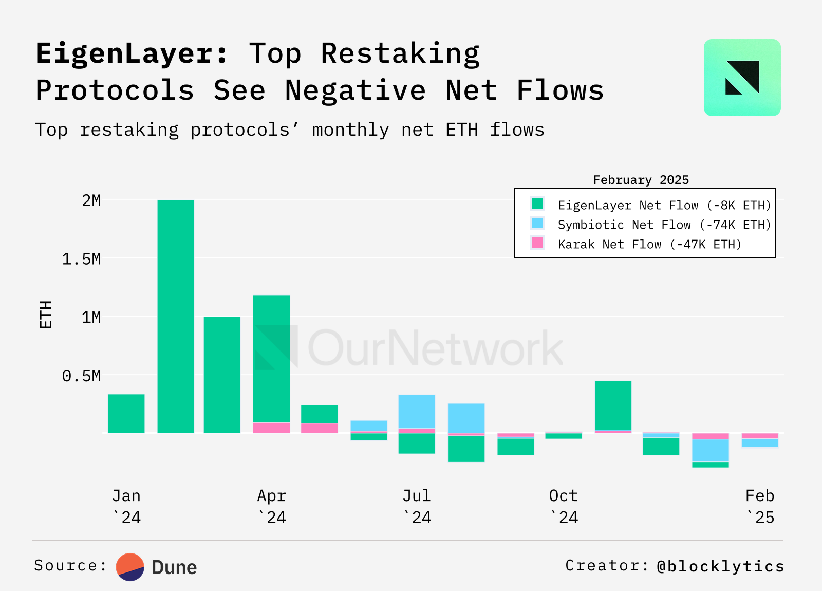 - EigenLayer still dominates the restaking market with an 89% share — a ~5% increase since September 2024 — gained at the expense of Symbiotic and Karak, which now hold 7.6% and 3.3%, respectively. Most of this capital rotation started to happen on the second week of January 2025.