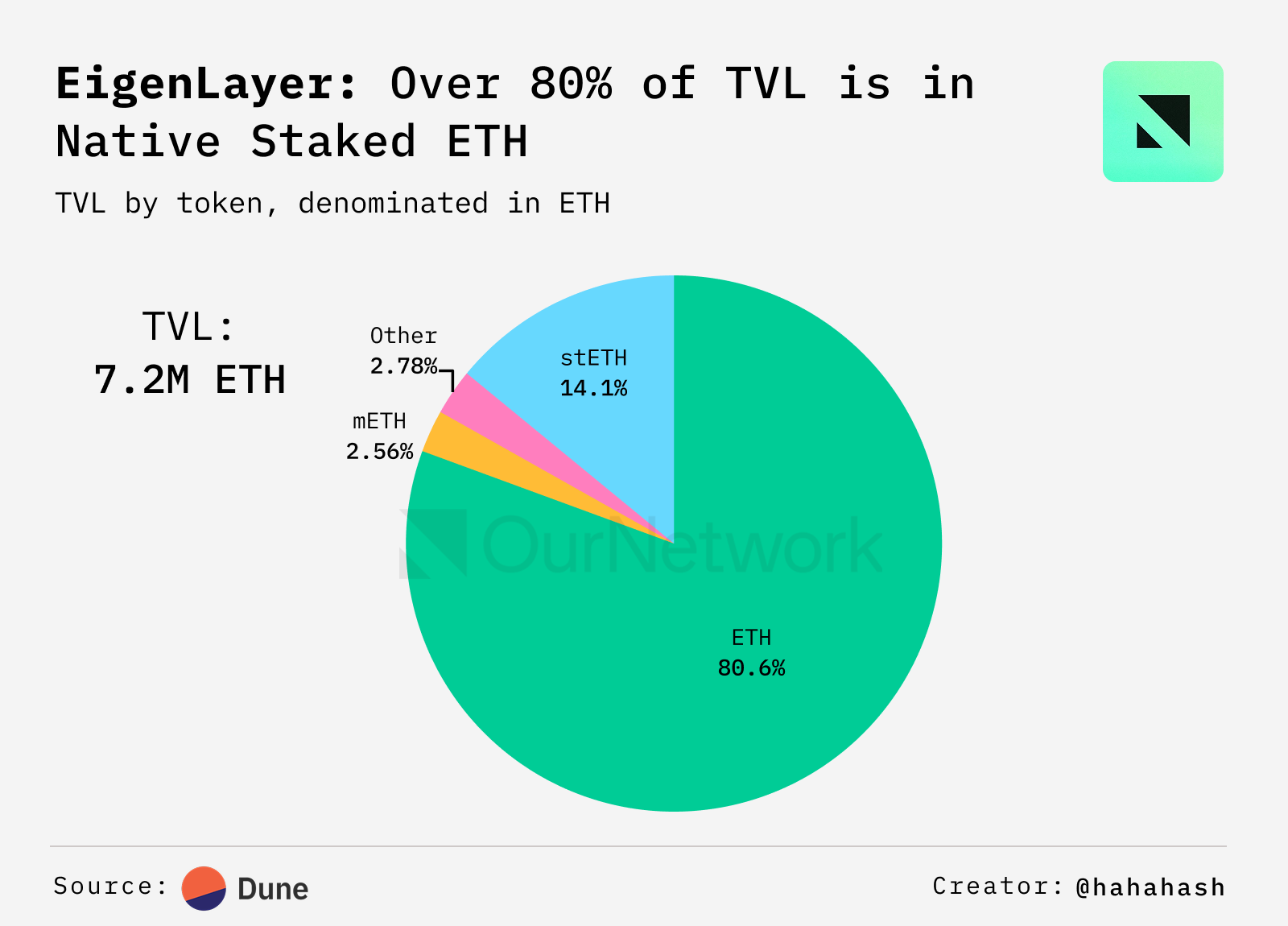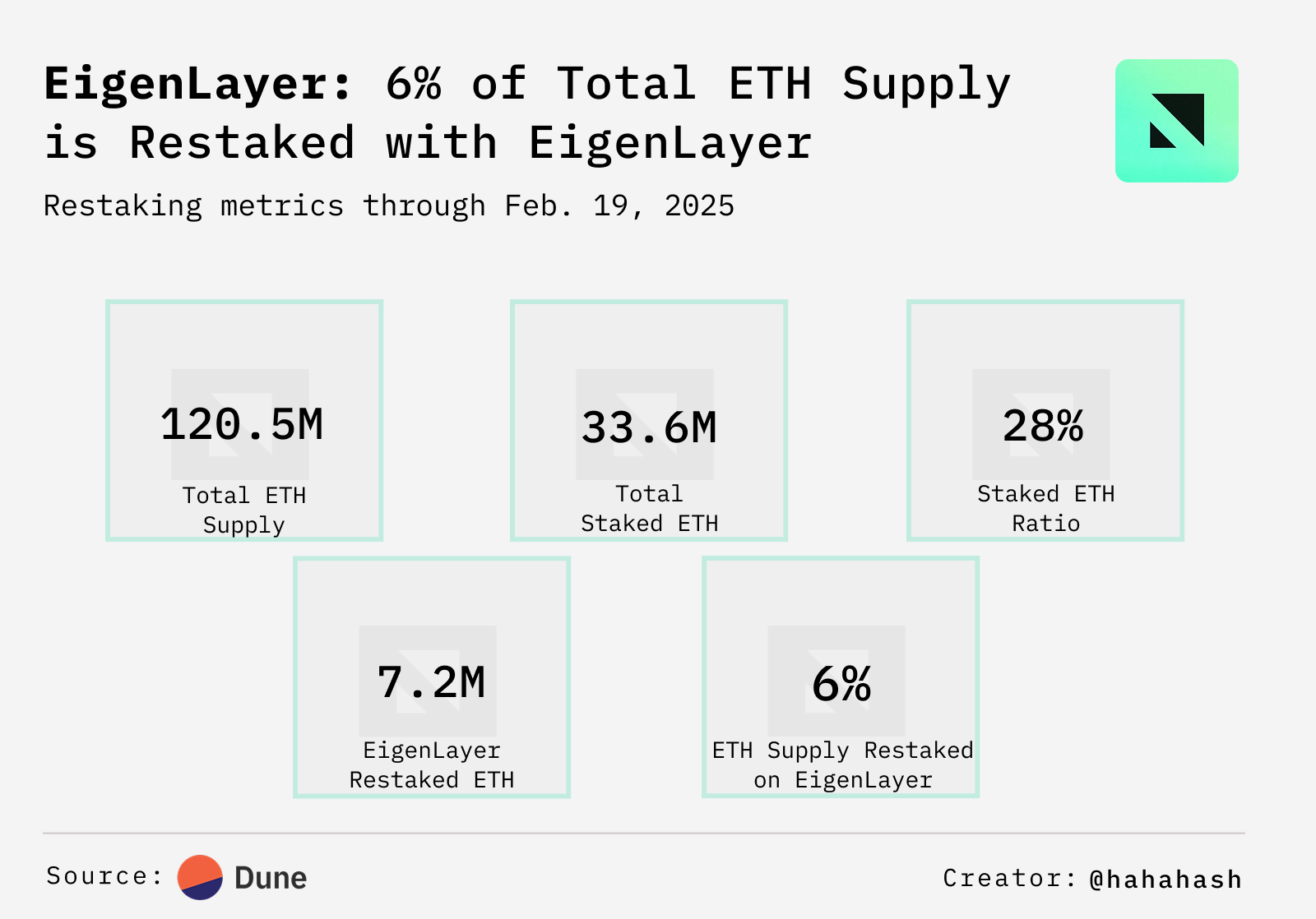 - Out of the total ETH supply of over 120M, nearly 34M ETH is staked, making up about 28%. Of that, over 7M ETH is restaked with EigenLayer — close to 6% of the total supply — demonstrating a strong commitment from depositors and node operators to the network’s security.