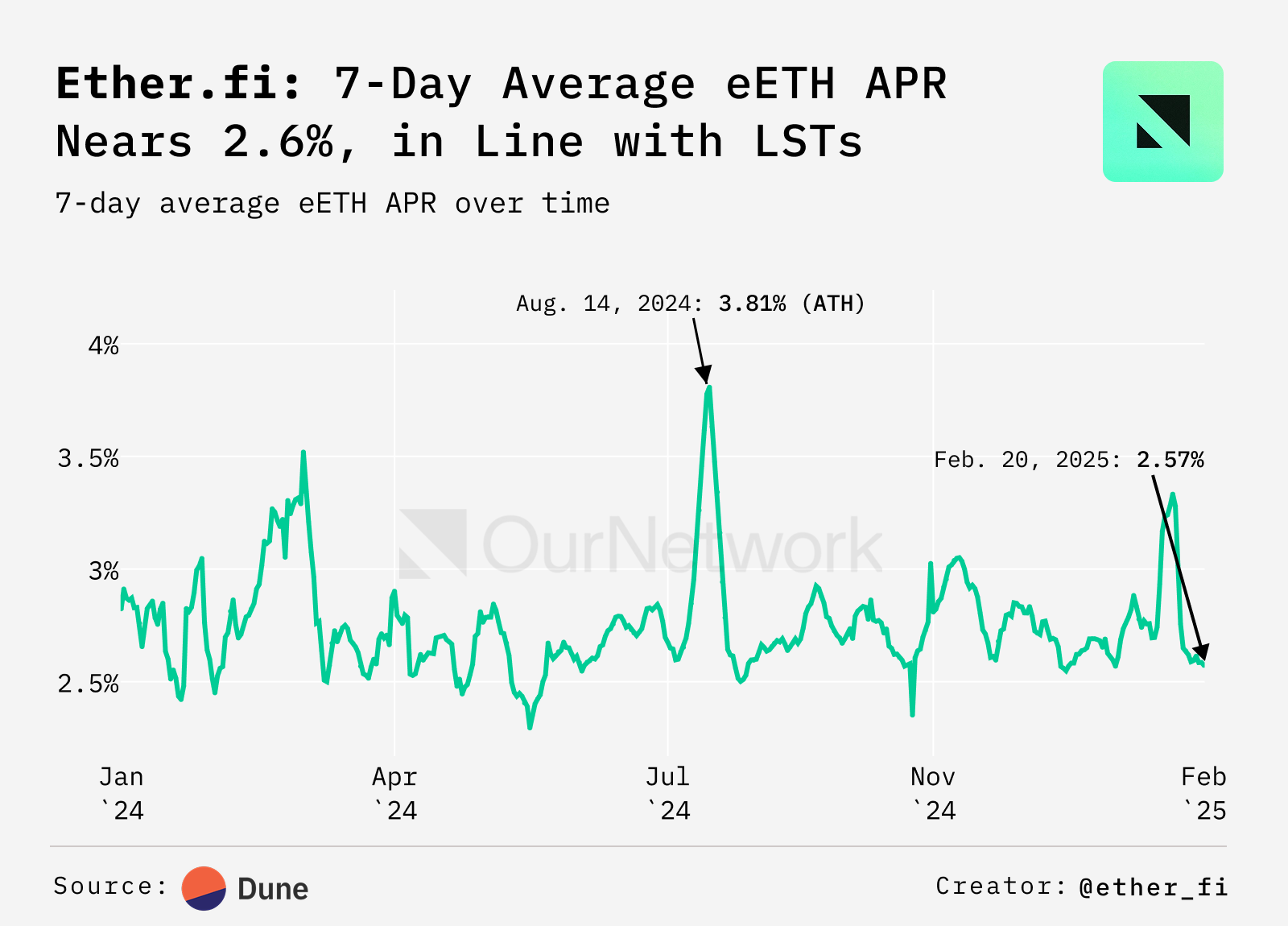 - The seven day moving average of eETH, an LRT, is at 2.6% as of Feb. 20, 2025. That's in-line with LSTs like Lido's stETH and Rocket Pool's rETH.
