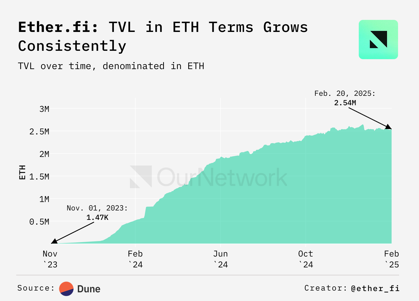 - Ether.fi is a non-custodial staking protocol whose key offering, eETH, is integrated with Eigenlayer to offer restaking rewards. The protocol reached 2.54M ETH in TVL, according to Dune Analytics. Deposits into Ether.fi are routed into different protocols — key among those is Eigenlayer, where Ether.fi's deposits constitute over 40% of the protocol's TVL. Ether.fi's deposits are also over 40% of Symbiotic's TVL, showing Ether.fi's impact in the restaking space.