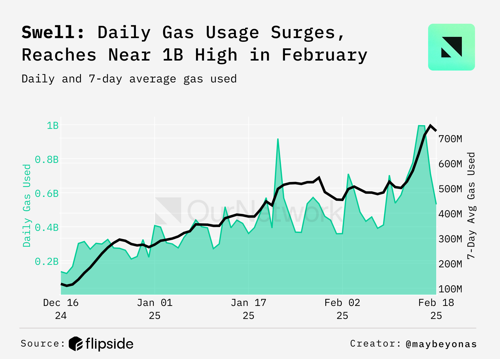 - Swellchain’s gas consumption has surged since December, with spikes tied to new protocol launches. The steady rise in daily gas used and seven-day moving average (DMA7) signals growing network demand. Continued acceleration suggests increasing adoption, reinforcing Swellchain’s role as quietly growing DeFi restaking hub.