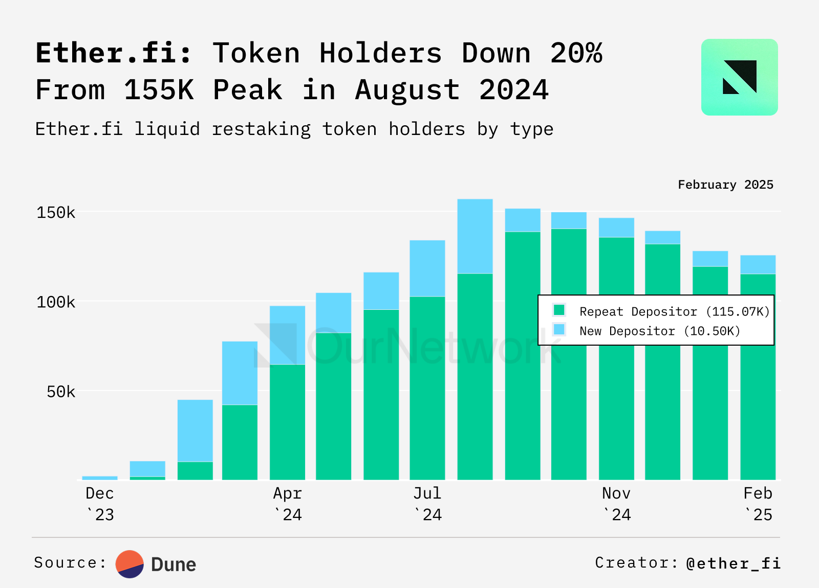 - Ether.fi experienced a steady increase holders — defined as holding at least $10 of any of the platform's LRTs — since its launch in November 2023. Unique holders peaked at 150,000 in August 2024 and have since dropped 23% to 115,000.