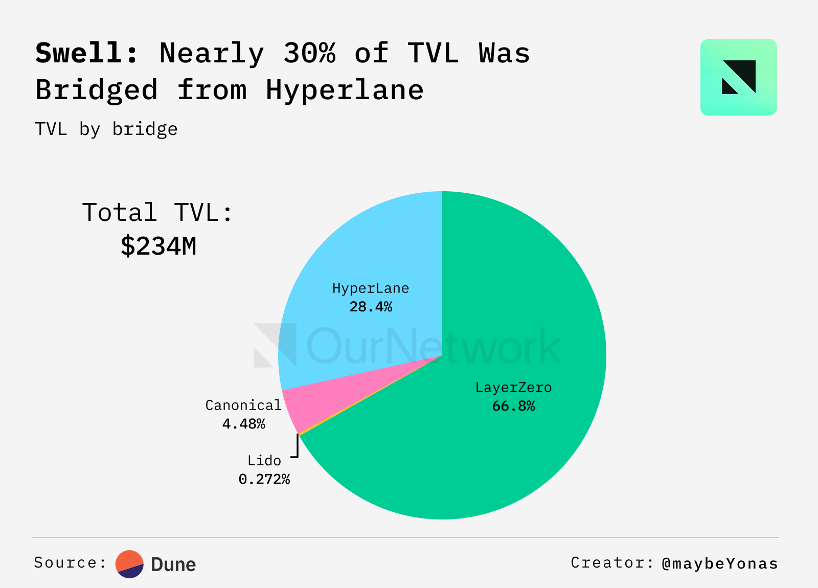 - Swellchain has unique ties to actively validated services (AVS) and networks it secures, like Ditto and Hyperlane. While its restaking products secure these services, Swell also uses them, creating harmonic incentives. For instance, approximately 30% ($67M) of Swellchain’s TVL was bridged via Hyperlane.