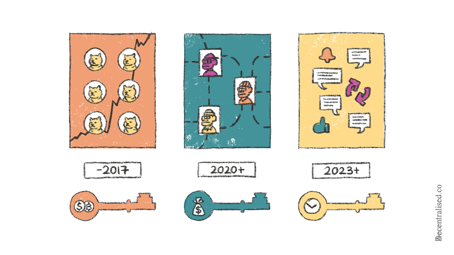 In 2017, during the ICO boom, we witnessed the explosion of on-chain communities. People would send capital to receive tokens. Financial primitives (like tokens) were powerful tools for building a community, as they gave people a shared purpose, goal and interest. But a year later, when those tokens' prices went down, the communities faltered. We see a resurgence of this trend now with meme assets.