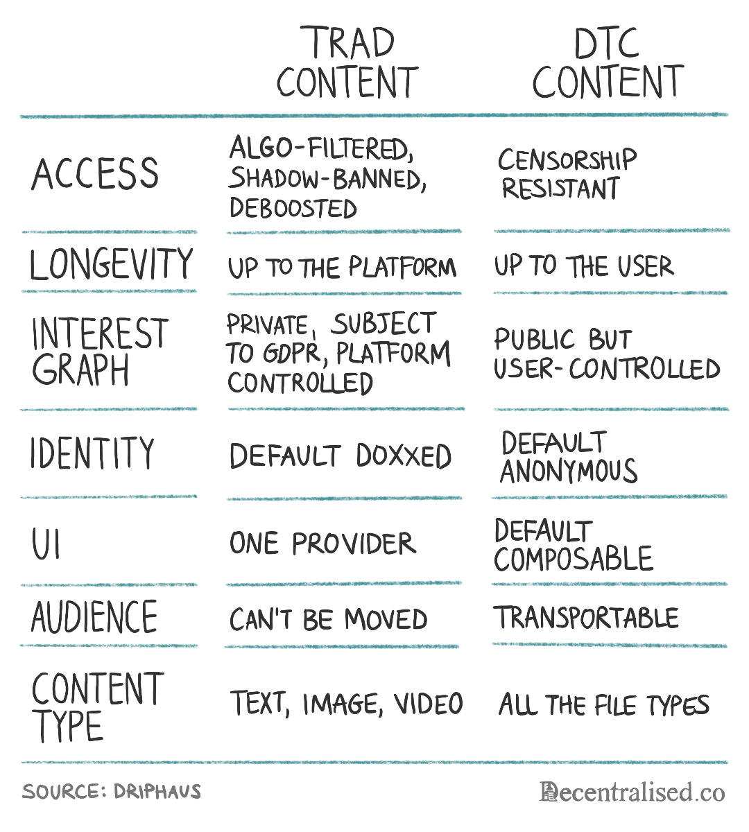 Of that sum, 30% goes to Driphaus, which leaves the artist with meaningful income.The following table is originally from Driphaus’ seed-stage deck shared by Vibhu on Twitter. It is a good breakdown of how content differs in the context of platforms and on-chain presence.