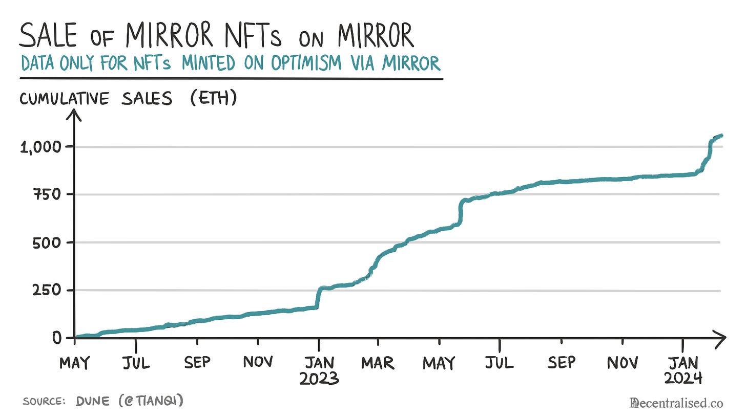 Let me step back a little. You used to be able to create content on Mirror and have NFTs issued. But its discovery still relied on your social graph on a third-party platform like Twitter. Creators that already had distribution benefited from them. The shift now emerges from a crypto-native audience gathering on Web3-native social networks.