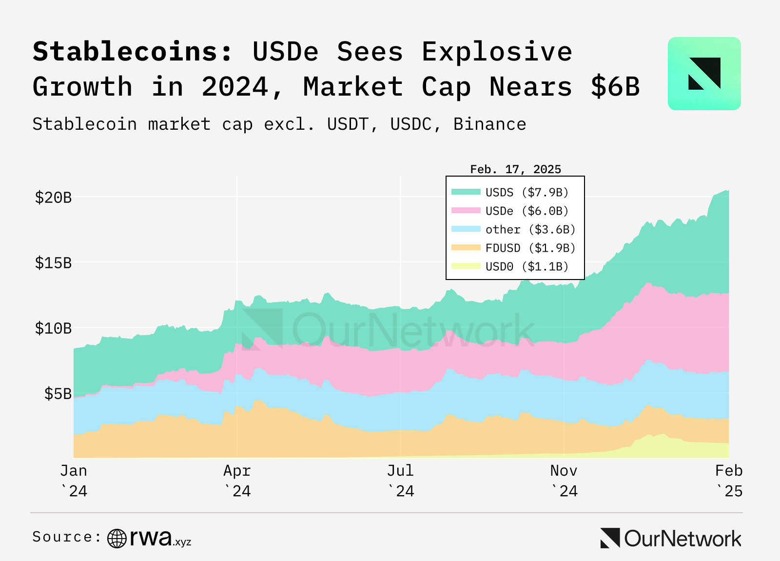 - Beyond the major centralized issuers, new entrants like Ethena’s USDe (+$5.9B) and Usual’s USD0 (+1.1B) have carved out significant market positions. Another stable, FDUSD, initially saw growth from promotional incentives but lost market share as these incentives ended and competition intensified.