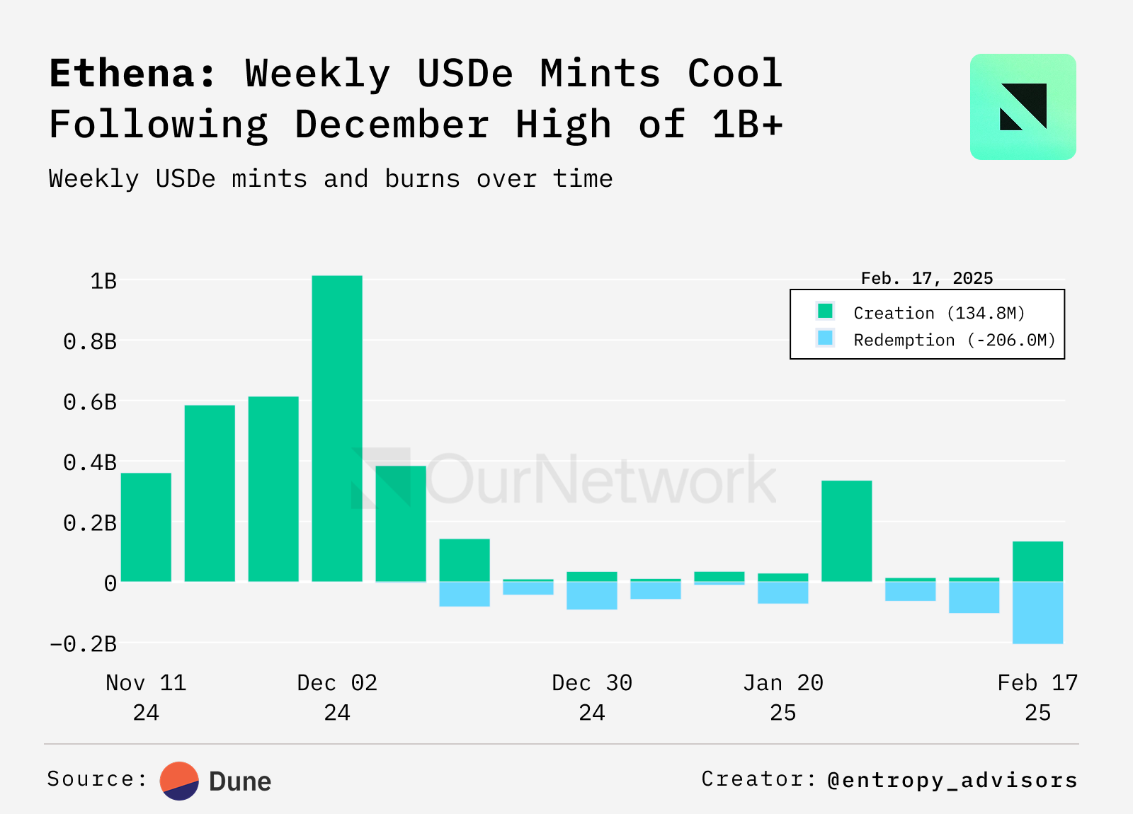 - USDe is the synthetic dollar developed by Ethena. On Dec. 5 2024, USDe creation skyrocketed to $332M in a single day as Bitcoin crossed $100K. Mints have cooled since then however.