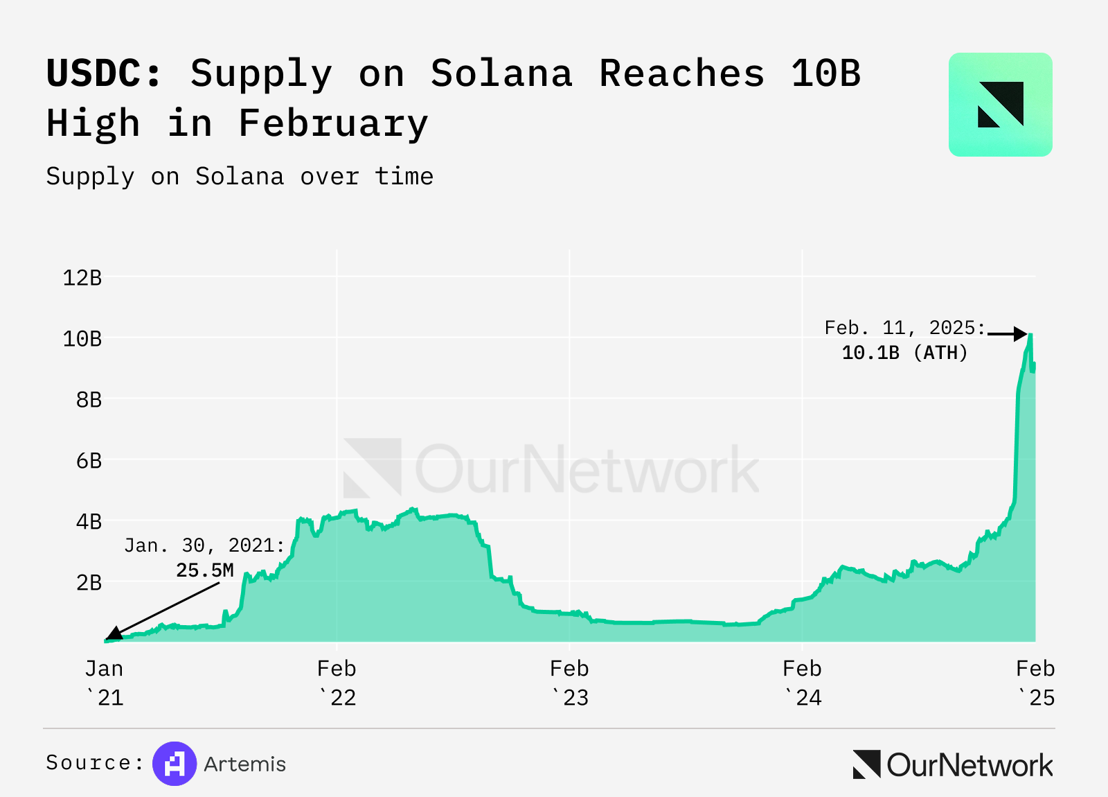 - Solana has been a significant driver of USDC supply, with circulating supply increasing from $2.5B in Sept. to over $10B in Feb. Solana has seen a surge of trading volumes which has boosted USDC supply.