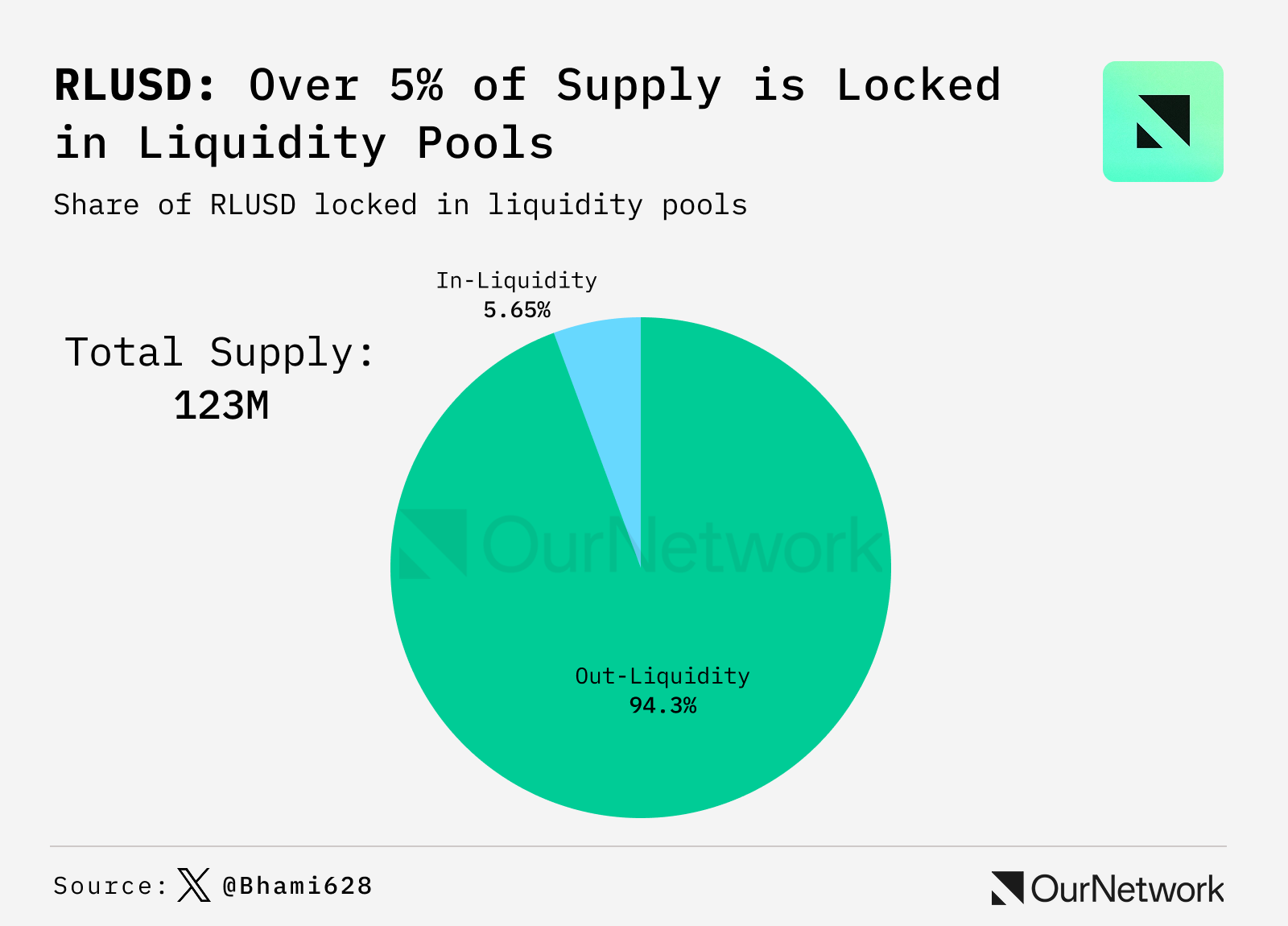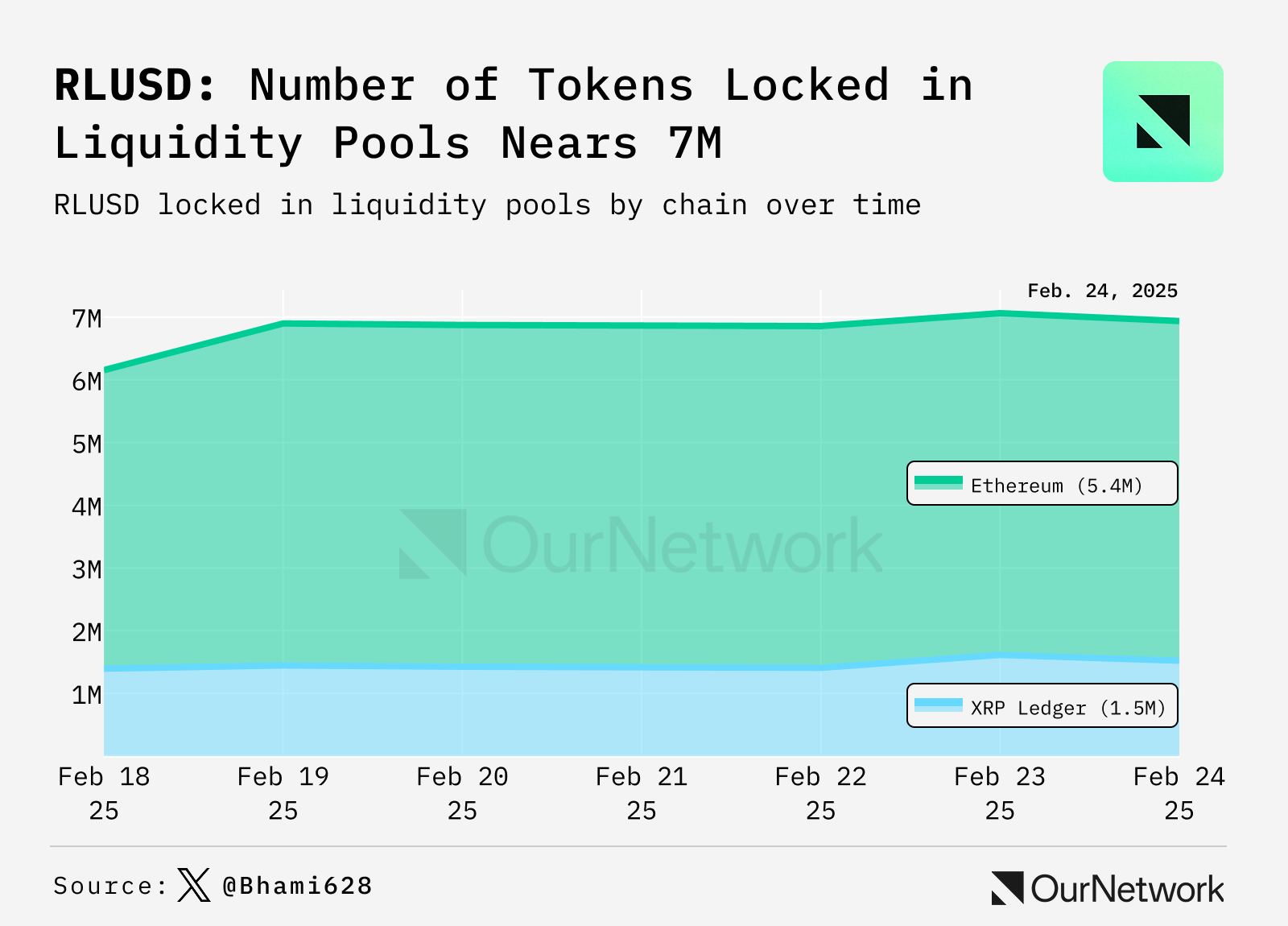 - Over 5% of RLUSD supply, totaling $6.9M, is locked in liquidity pools, with 78% of that amount held in pools on Ethereum. Due to limited timeseries data availability for XRPL assets, it's necessary to manually track RLUSD in XRPL’s DEX since Feb. 18. Liquidity on both chains has remained steady.