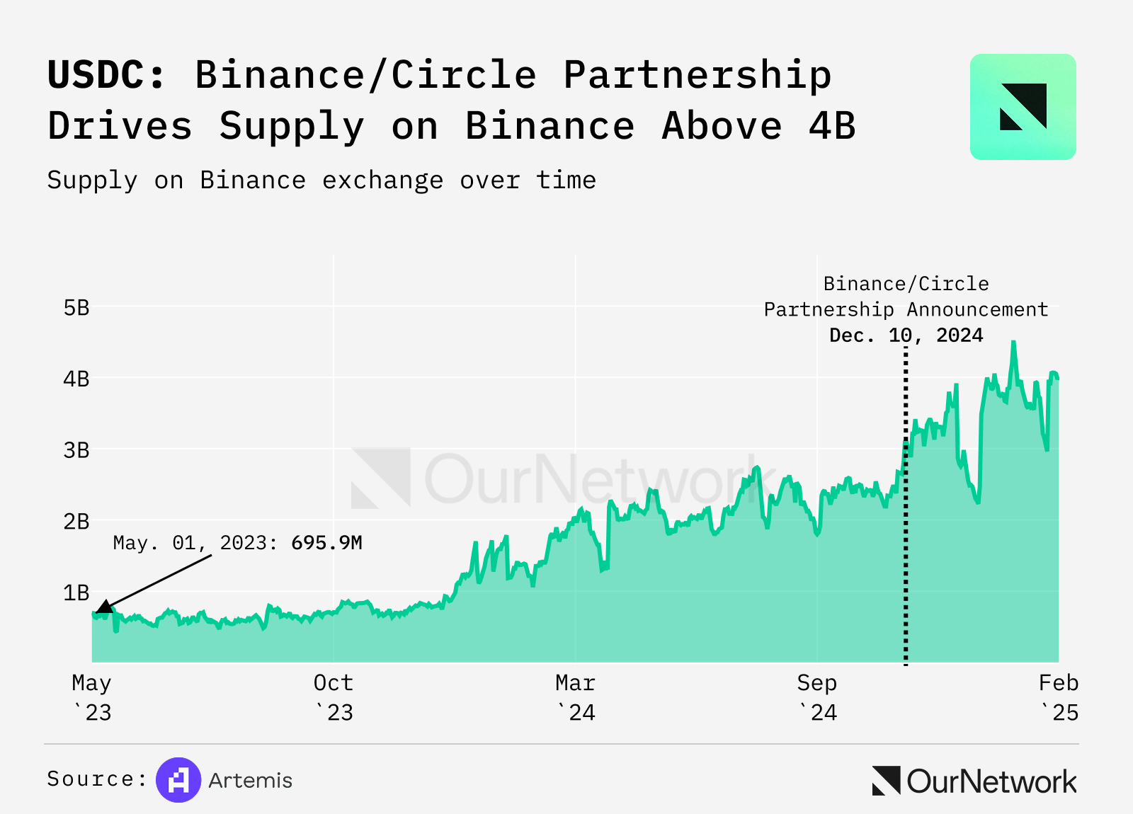 - USDC has also been growing steadily on Binance, the world's largest centralized exchange (CEX). After Binance and Circle, USDC's issuer, announced a partnership, supply of the stablecoin accelerated on the platform. Binance represents a key growth vertical for Circle as the stablecoins FDUSD and USDT have thus far been the dominant stablecoins on the CEX.