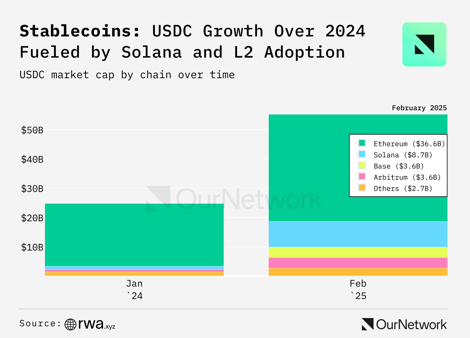 - USDC’s outperformance relative to USDT was largely driven by its adoption outside Ethereum’s mainnet. There was explosive growth of over $7.7B worth of USDC on Solana, likely fueled by a surge in memecoin trading activity. USDC also gained significant traction on Ethereum Layer 2 networks such as Base and Arbitrum.