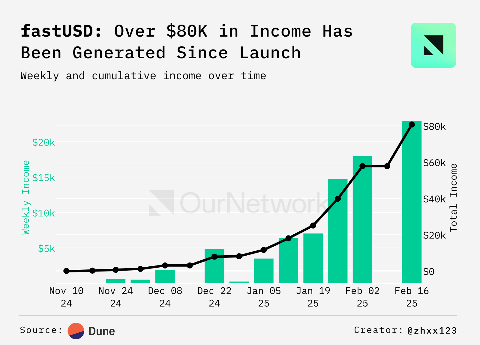 - fastUSD's yield-generating capabilities show impressive performance metrics with total income growing from near-zero in November 2023 to approximately $80K by February 2024.