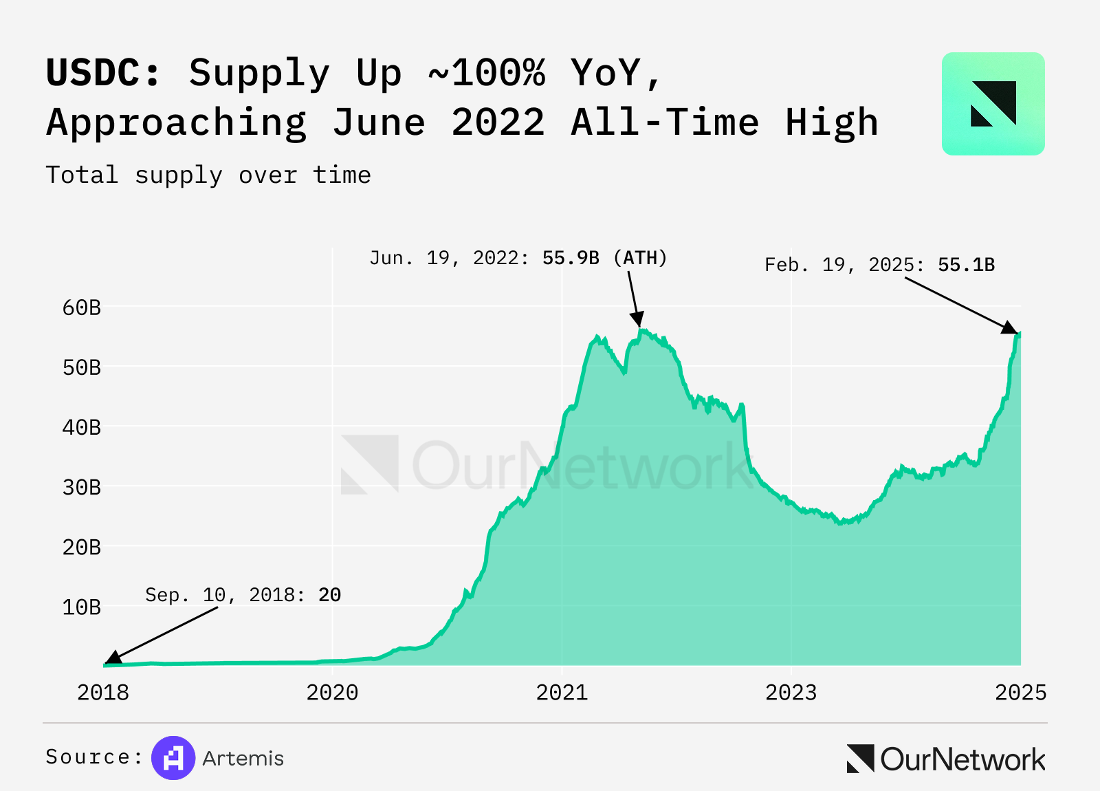 - USDC has had an impressive run with circulating supply now nearing all time highs at $55B, up ~100% year-over-year. USDC is now available on 19 chains and has 4 chains where supply is over $1B.