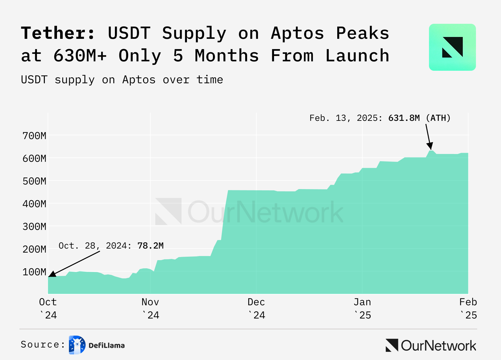 - Aptos has also served as a venue for USDT's expansion — the stablecoin hit a $630M circulating supply in the five months since officially deploying on the blockchain. \
