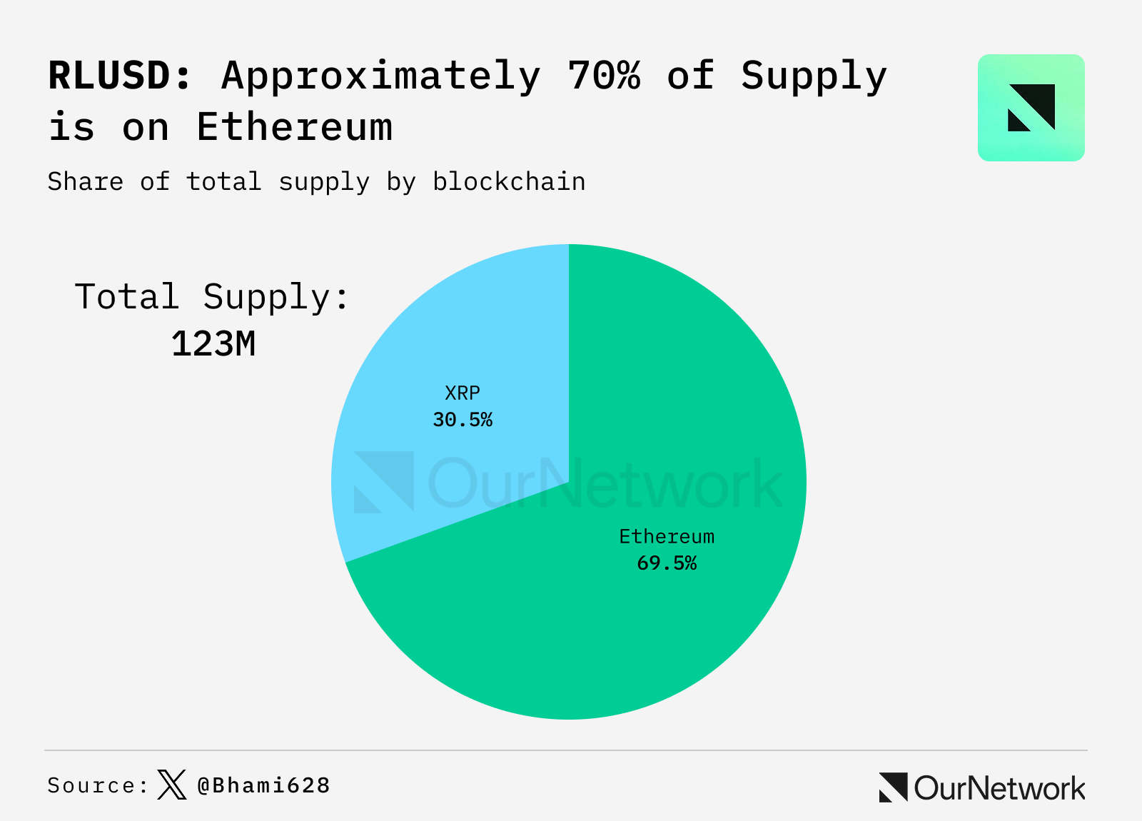 - Ripple USD (RLUSD), a stablecoin issued by Ripple, launched in December 2024. Although some data providers report varying figures, onchain data from Etherscan, XRPScan, and the Ripple website confirm a circulating supply of roughly 123M RLUSD at the time of writing. Despite its strong ties to Ripple and the XRP Ledger (XRPL) ecosystem, approximately 70% of the total token supply resides on Ethereum.