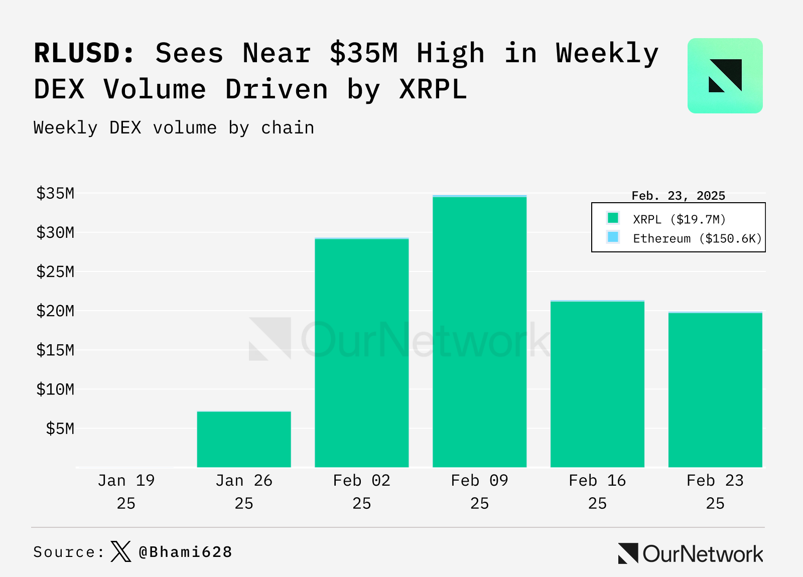 - Although more supply exists on Ethereum, XRPL’s native decentralized exchange (DEX) accounts for 99% of DEX-based trading volume. The highest weekly volume so far occurred during the week ending Feb. 9, with combined DEX volume on Ethereum and XRPL approaching $35M. Cumulative DEX volume has now surpassed $120M.