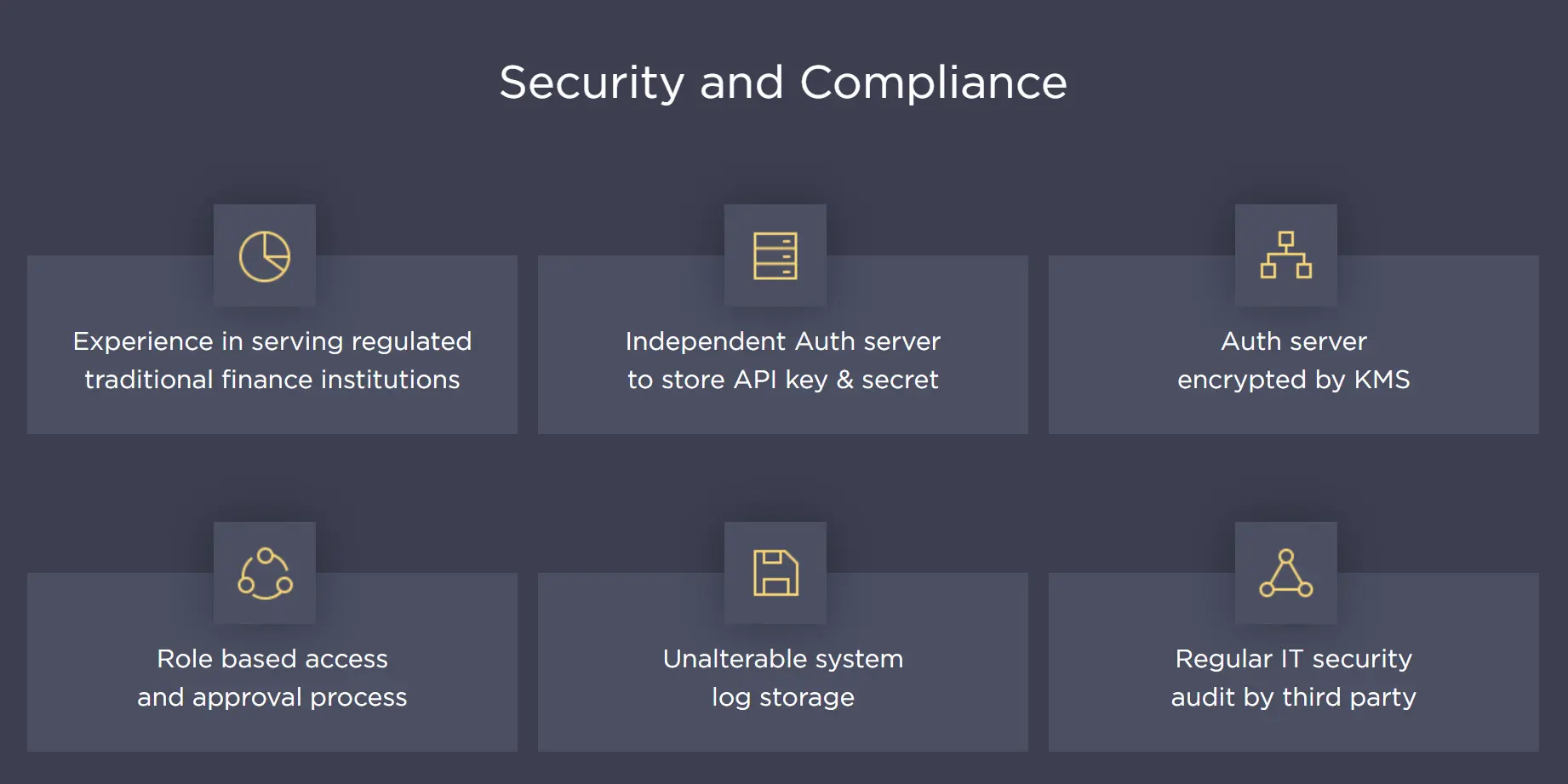 The security and compliance of 1Token are also ensured. They have experience serving regulated traditional financial institutions and possess an independent authorization server to store API keys and secrets. The authorization server is encrypted with KMS and includes role-based access and approval processes, immutable system log storage, as well as regular IT security audits conducted by third parties.