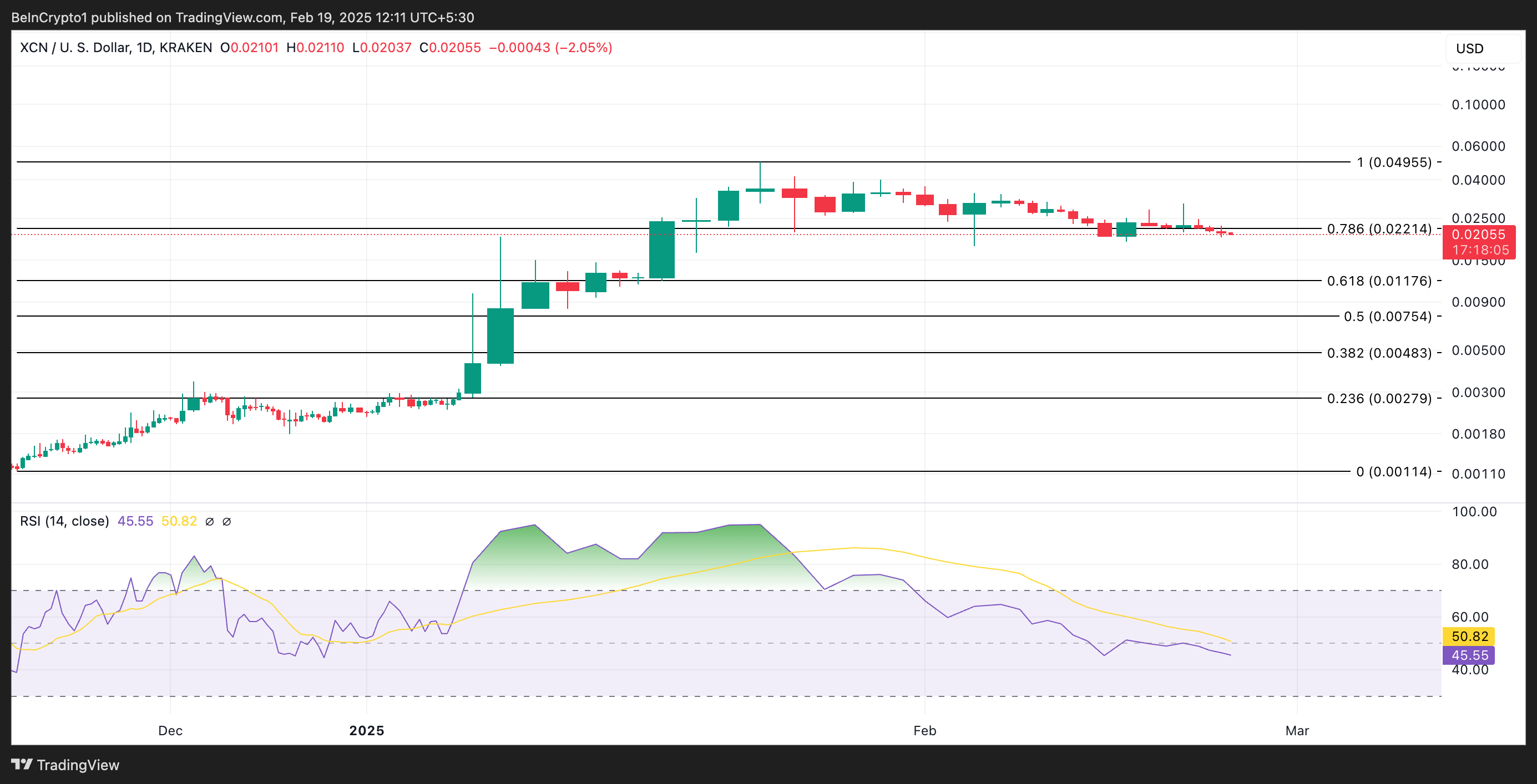 XCN’s RSI is at 45.55 and falling, which indicates weakening bullish momentum as sellers strengthen their control. If this persists, the token’s price could plunge to $0.011.