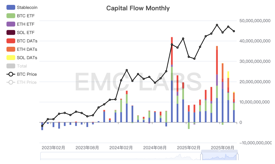The first large-scale inflow of funds stemmed from the approval of the BTC ETF, while the second large-scale inflow came from the election of "crypto-friendly president" Trump. The third largest value realization in this bull market occurred between March and July 2025, driven by the easing of the US-China trade war and expectations of a Federal Reserve interest rate cut. However, this inflow abruptly stopped after pushing the price of BTC to $120,000.