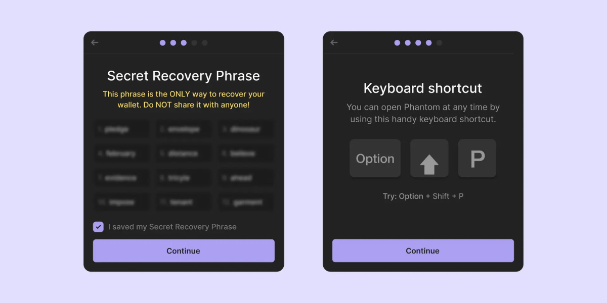 Do not share it with anyone, not even Phantom support. If someone gets your phrase, they can take your money. After writing it down, click “Continue” again.