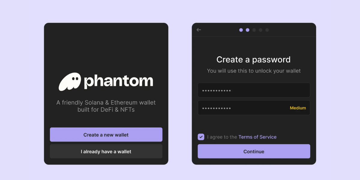When Phantom opens, click on “Create New Wallet”. You’ll need to make a strong password. This password is for this browser only, so use something unique but easy for you to remember. Once you type your password, click “Continue”.