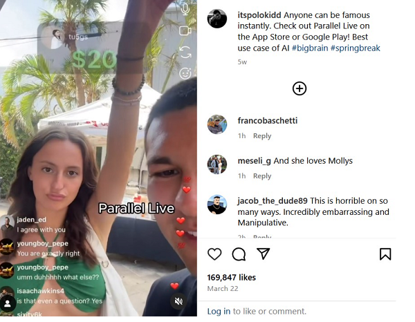 New apps called Parallel Live and Famefy use AI-generated audience interaction to fake big social media audiences for live streams – with pickup artists reportedly using the apps as social proof to impress women. In one video, influencer ItsPolaKid shows a woman in a bar that he’s “live streaming” to 20,000 people, she asks him if he’s rich, and they wind up leaving together. “The audience is AI generated, which can hear you and respond, which is hilarious. She couldn’t get enough,” the influencer said.