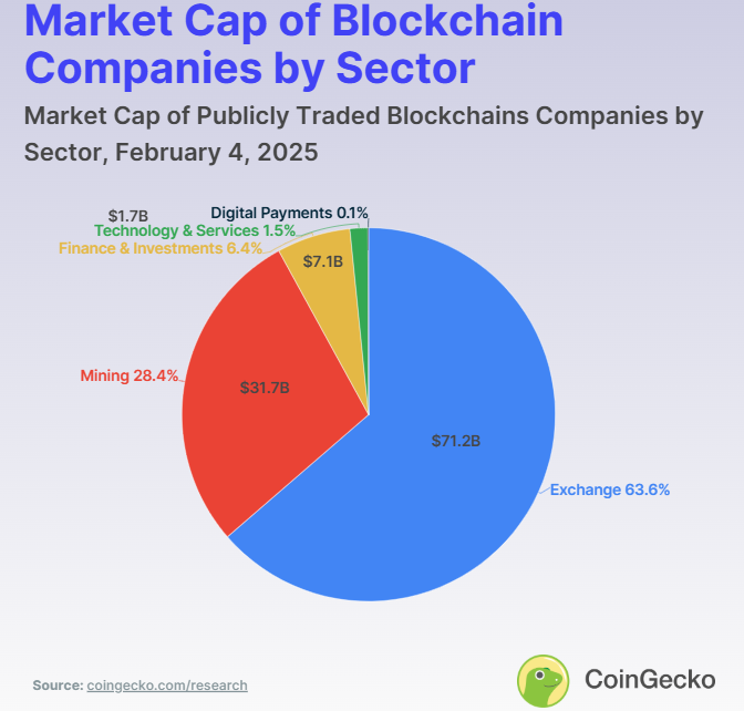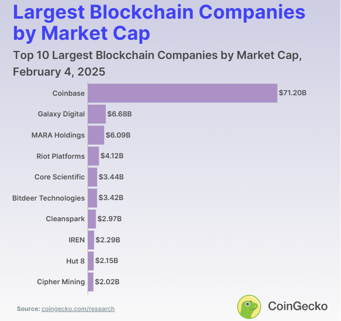 The report, released on February 4, shows only 46 notable publicly traded blockchain companies. The majority, 24 in total, are listed on NASDAQ, with Coinbase (COIN) leading by a significant margin. Coinbase, the largest US-based crypto exchange, boasts a market cap of $71.2 billion.