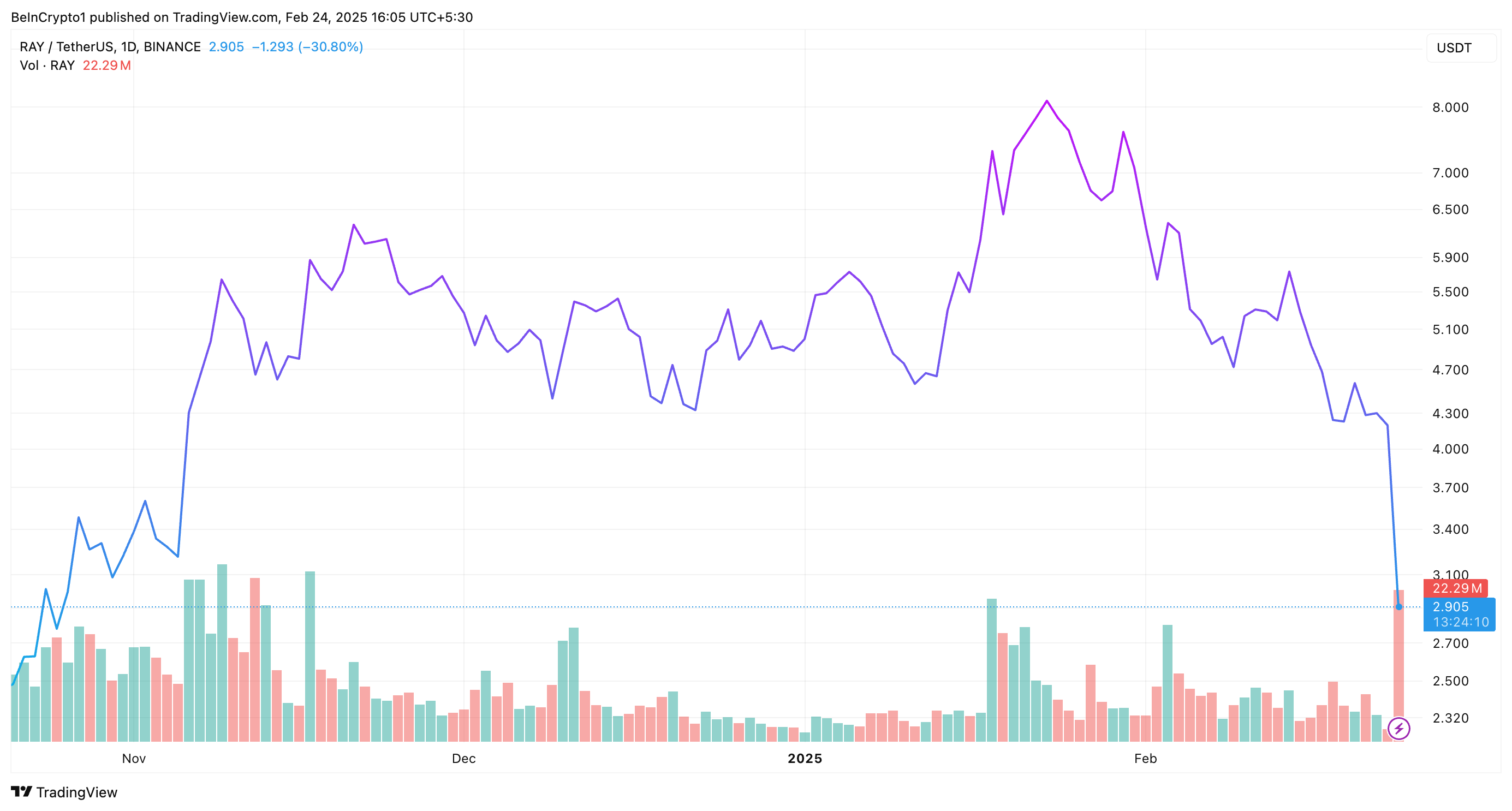 Over the past day, RAY has seen a 31% drop in value. At the time of writing, the token traded at $2.9. This marked its lowest price since late October 2024.