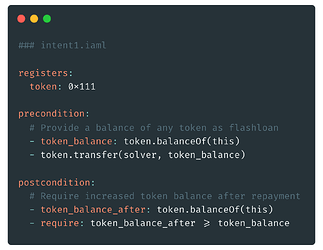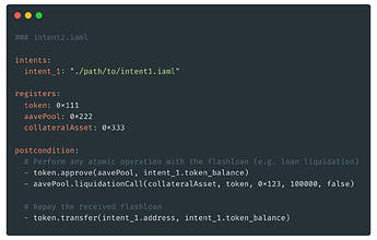 IAML is a high-level, Turing-complete intent DSL designed for writing intent programs. Intent programs consist of partial programs signed by multiple parties and collaboratively forming the application logic. These complementary programs can define both declarative constraints for state transitions and imperative smart contract function calls. Further, IAML enhances composability by enabling to break down complex intent logic into atomic units simplifying settlement through generalized coincidences of wants (CoWs). Only if all constraints of all partial programs are satisfied, the intent program becomes executable through the Engine.