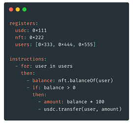A single signature from an EOA orchestrates an agent to operate with user funds in a non-custodial way based on the defined intent program without requiring approvals or transferring assets. In this scenario the whole program is defined within a single intent and thus the agent just needs to execute it if the conditions are met. This account-specific automation design makes the intent program sharable with other parties fostering reusability and composability.
