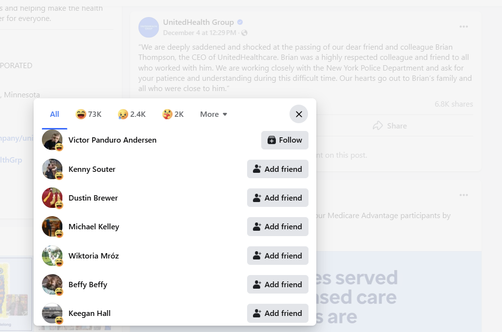 On Facebook, UnitedHealth Group locked comments on its post mourning the death of its “dear friend and colleague,” but it couldn’t block people from reacting with emojis, which more than 73,000 have so far with the crying-laughing face (compared to around 2,400 doing a sad face). Laugh-reacting became a meme of its own on Facebook, with a lot of the more than 6,800 shared posts including people telling friends to go hit the laugh emoji.