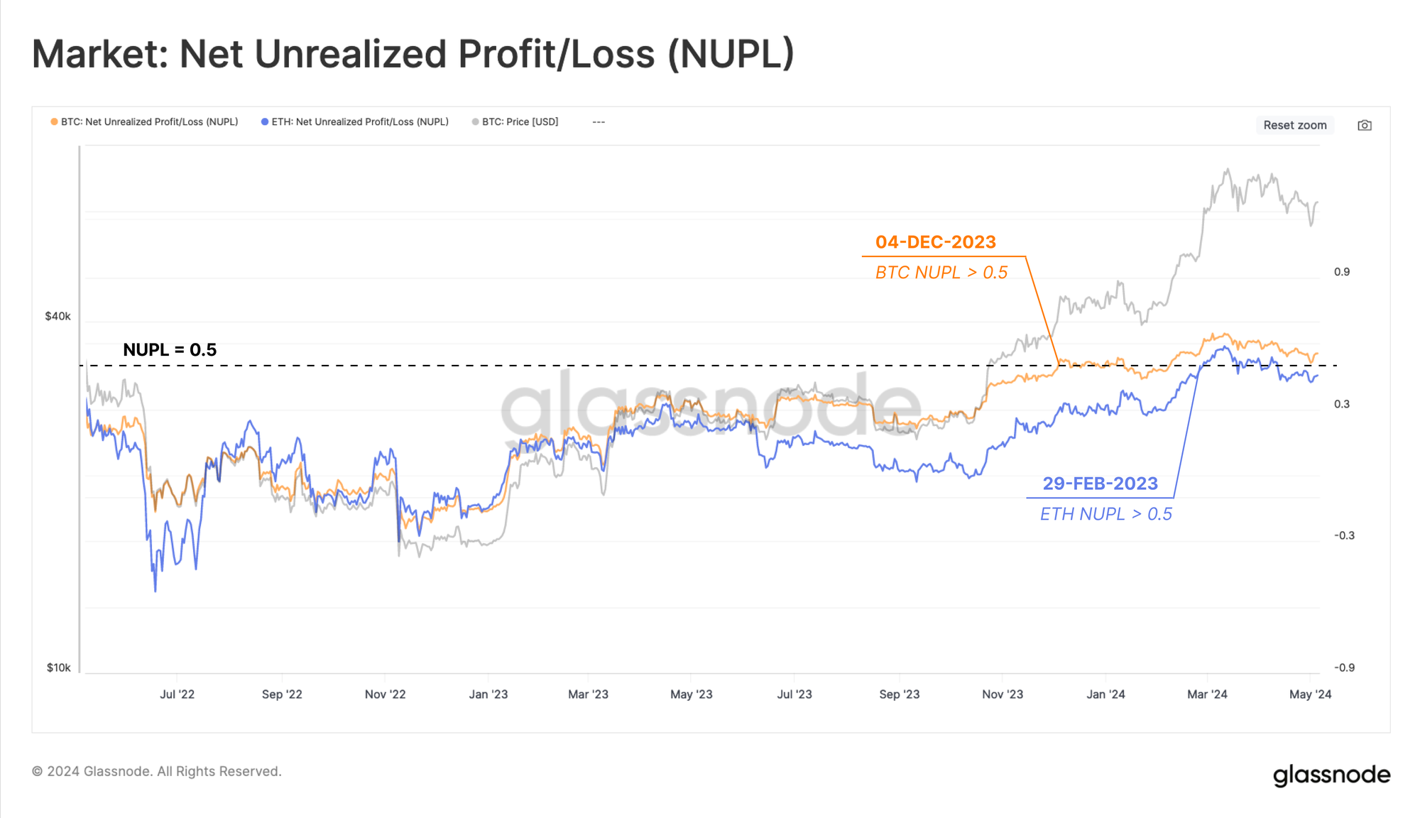 Amidst the hype and market rally surrounding approval of the spot Bitcoin ETFs, the unrealized profit of Bitcoin holders expanded considerably faster than that of Ethereum investors. As a result, the Bitcoin NUPL metric crossed 0.5 and entered the euphoria phase three months before than equivalent metric for Ethereum.