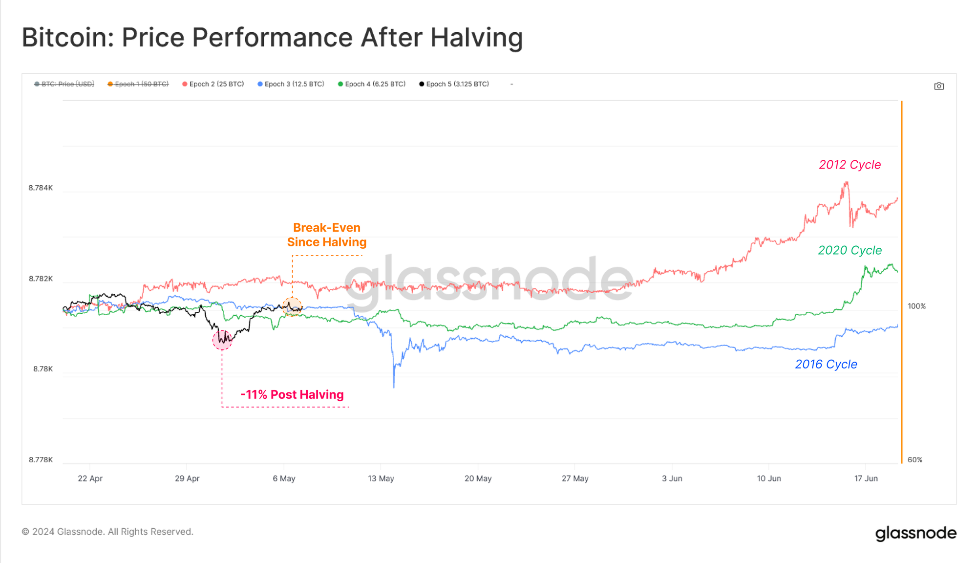 - The Fourth Bitcoin Halving initially led to a sell-off, with BTC prices falling to $57k before recovering swiftly. This is now the deepest pullback since the FTX lows.