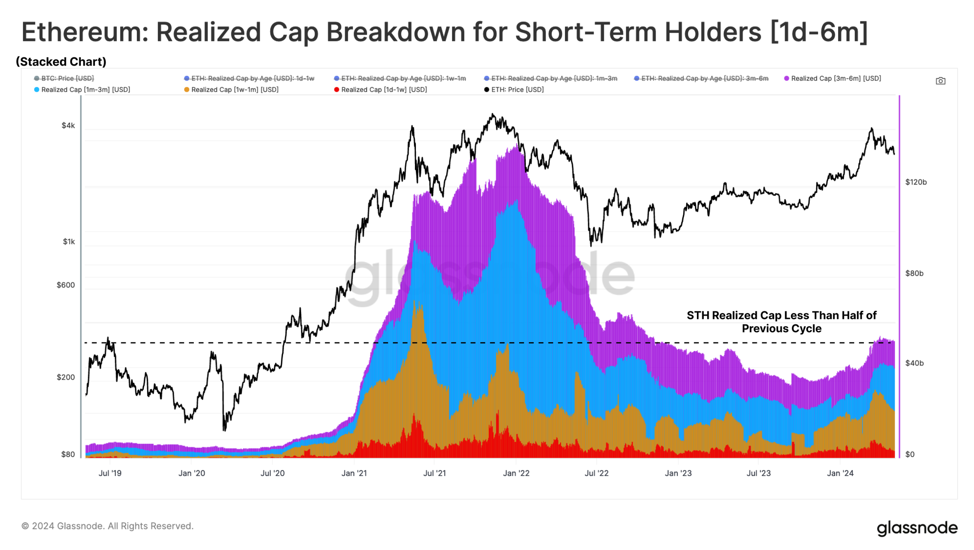However, this trend has not been mirrored for ETH, which has not yet seen price break above the 2021 ATH yet. Whilst Bitcoin's STH-Realized Cap is nearly on par with the last bull run peak, ETH's STH-Realized Cap has barely lifted off the lows, suggesting a markedly lacklustre inflow of new capital.