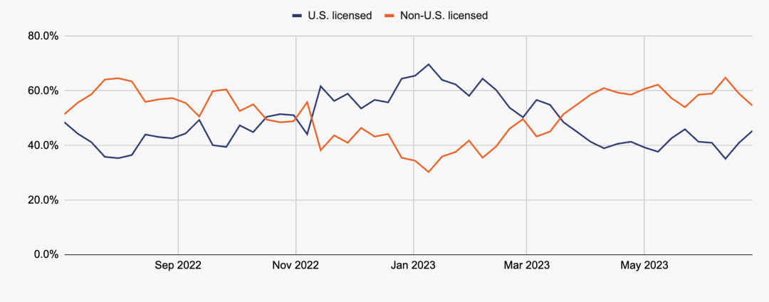 As of June 2023, about 55% of stablecoin inflows to the top 50 services were going to non-U.S.-licensed exchanges, the report stated.