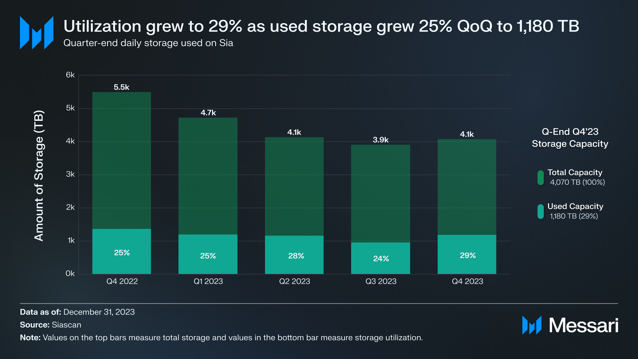 While the capacity of a storage network helps highlight its current scale, its utilization rate reveals the demand for the type of storage it optimizes for. Sia operates in the hot storage market, primarily targeting developers. It's favored by those in search of a decentralized storage system offering both privacy and fast retrieval.