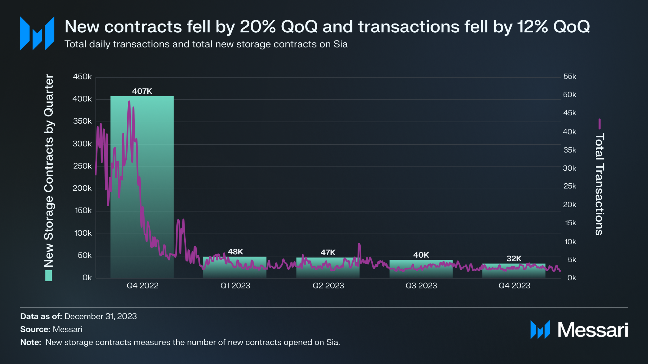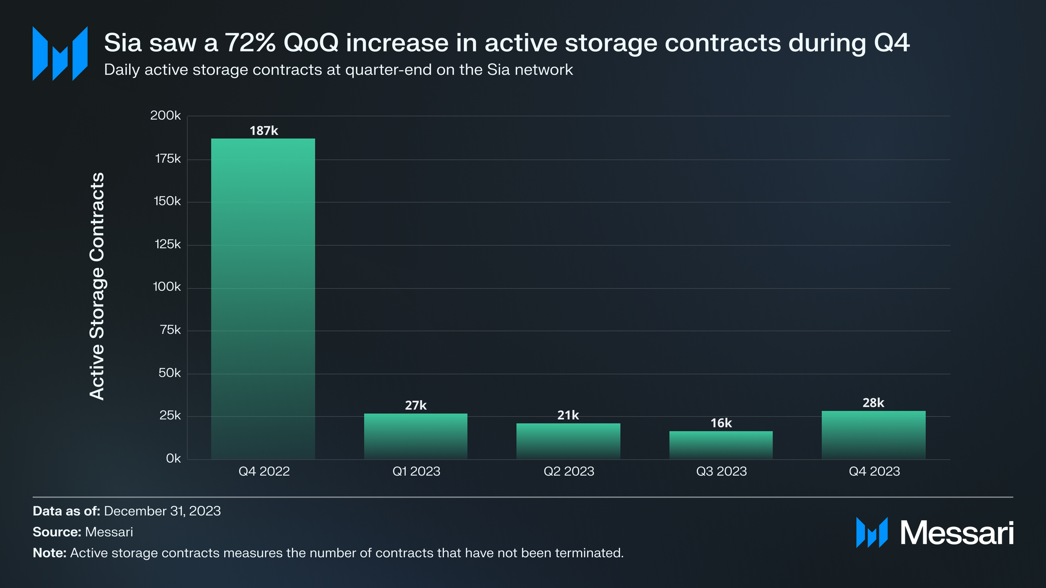 Sia active storage contracts grew in Q4, after declining for three consecutive quarters. The network saw a 72% QoQ increase in active contracts, despite falling 85% YoY. The beta version for Sia’s renting interface (renterd) was released in Q3, making the network easier to access for renters. The renting interface was fully released at the end of December, introducing an S3-compatible gateway that enables renters to use well-known tools like Duplicati (backup software). Both developments aim to make Sia more user-friendly than before. This release, combined with more optimistic market sentiment, may encourage future growth for Sia.